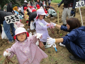 若松の農園にていもほり遠足に行きました。秋の自然に触れながら、力いっぱいうんとこしょ、どっこいしょ 大きな芋がたくさん掘れ子どもたちも大喜び!