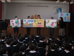 劇団杉の子観劇幼稚園の遊戯室が劇場に大変身!!劇団杉の子さんの「おおきなかぶ」と「マーリャンとまほうのふで」の人形劇を観ました。子どもたちもとても楽しいひと時を過ごしました。